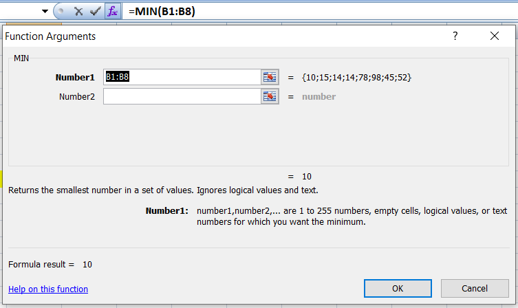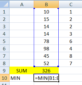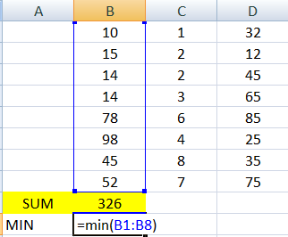 First step is to type =MIN(select cell what you want to calculate) as show in below image =MIN(B1:B8).