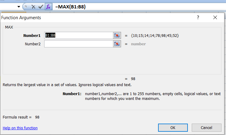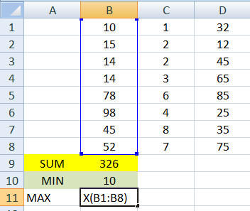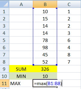 First step is to type =MAX(select cell what you want to calculate) as show in below image =MAX(B1:B8).
